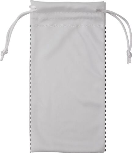 Custodia occhiali in poliestere con chiusura a coulisse, ideale per personalizzazioni in sublimazione.