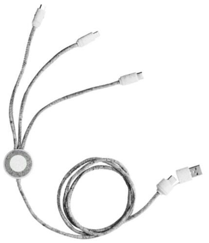Set cavi per la ricarica in lunghezza 120 cm, connettore combinato da USB-A/USB-C a Lightning e micro-USB, cavo in sughero, prese in paglia di grano, confezionati singolarmente in una custodia in carta kraft