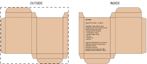 Blister con 10 caramelle alla menta di grandi dimensioni, con confezione in cartoncino kraft stampato a colori. MOQ: 100 pezzi.