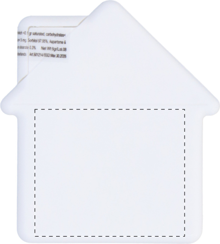 Contenitore di mentine in plastica a forma di casetta con circa 8 grammi di caramelle al mentolo senza zucchero.