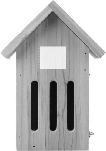 Casetta per farfalle in legno di pino, tre aperture sul lato anteriore, gancio in metallo sul retro per il montaggio, confezionata singolarmente in una scatola in cartone avana