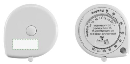 BMI, Misuratore indice massa corporea, pulsante di arresto, 1,5 metri, in ABS. Per uso promozionale