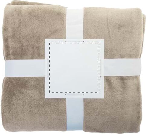 Coperta in pile di flanella RPET, 260 gr/m². Confezionata con nastro e cartoncino stampabile.