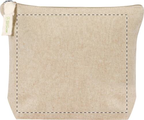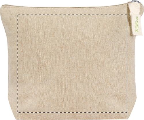 Pochette per cosmesi in cotone riciclato chiusa da una cerniera ed etichetta cotone riciclato.
