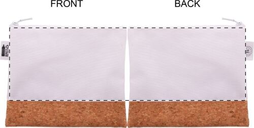 Trousse per cosmetici in poliestere 600D RPET e sughero, personalizzabile con grafica stampata in sublimazione su tutta la superficie e cerniera. MOQ: 50pz.
