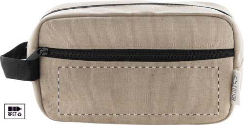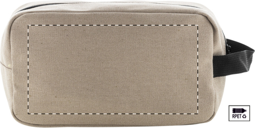 Trousse per cosmetici in canvas riciclato, 70% cotone riciclato e 30% poliestere RPET, con due scomparti chiusi da una zip, maniglia ed etichetta cotone riciclato.