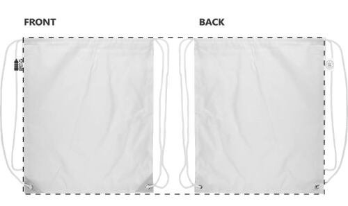 Sacca personalizzata con chiusura a coulisse, angoli rinforzati in pelle PU e cordini in tinta, in poliestere 190T RPET. Con grafica stampata in sublimazione su tutta la superficie ed etichetta RPET. MOQ: 25 pezzi.