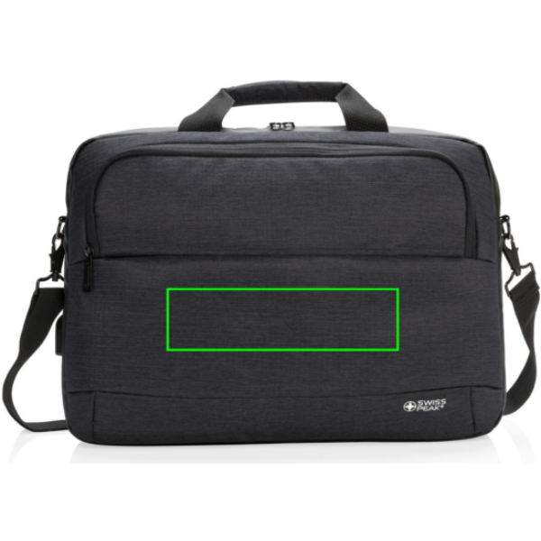 Borsa porta PC da 15” in poliestere two tone con inserti in PU. Ampio scomparto centrale e scomparto frontale. Connetti facilmente la tua powerbank alla porta USB integrata e carica il tuo smartphone o tablet mentre sei in giro. Con spallacci e cinghia per attacco al trolley.