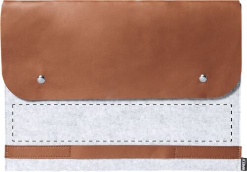 Cartella porta computer in feltro RPET con finitura e risvolto di chiusura in pelle PU ed etichetta RPET. Adatto a computer portatili fino a 15".
