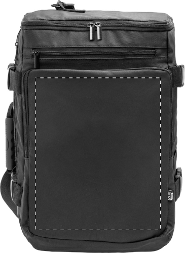 Zaino con doppia funzione di borsa portadocumenti in poliestere 600D RPETrivestito in PU impermeabile con scomparto principale con cerniera, due tasche anteriori chiuse da cerniera, tasca laterale, cinghie laterali con fibbia, scomparto imbottito per laptop (15"), schienale imbottito, spallacci staccabili ed etichetta RPET. Comprende un'ulteriore tracolla staccabile per la trasformazione in borse portadocumenti.