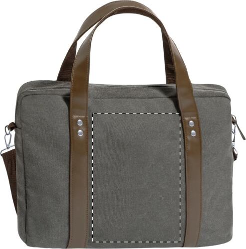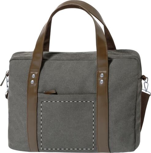Borsa portadocumenti in canvas con scomparto principale chiuso da cerniera e tasca frontale. Scomparto imbottito per laptop (15") e tablet (10"), tracolla regolabile, dettagli e manici in PU.