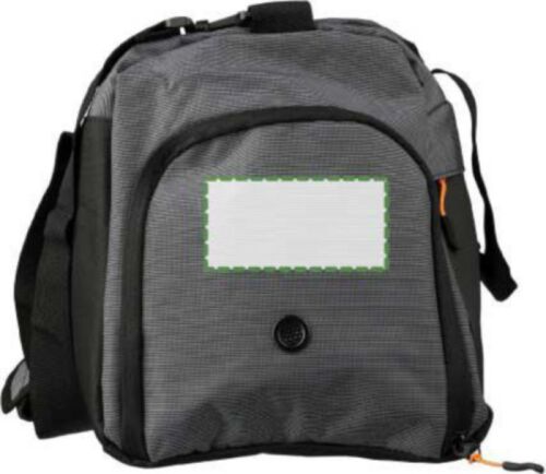 Borsone in poliestere 500 D bicolore, tasca frontale con chiusura lampo, scomparto laterale ventilato adatto per le scarpe, tasca in rete sul lato opposto, manici corti con velcro, ampio scomparto principale con fondo rinforzato