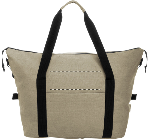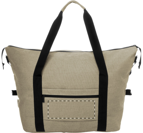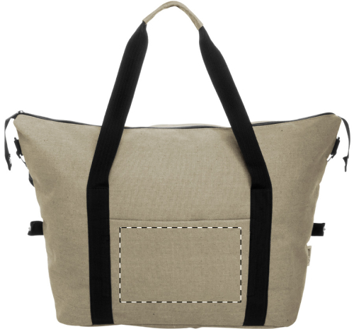 Borsa sportiva da viaggio in tela riciclata con scomparto principale chiuso da cerniera, tasca frontale, tracolla regolabile e tasca posteriore chiusa da cerniera con funzione anche di cinghia per trolley. 70% cotone riciclato e 30% poliestere RPET. Etichetta cotone riciclato.