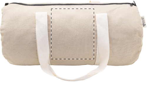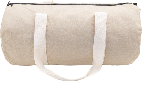 Borsa sportiva in tela composta da 70% cotone riciclato e 30% poliestere riciclato, con scomparto principale e tasca interna chiuse da cerniera, manici lunghi ed etichetta cotone riciclato.