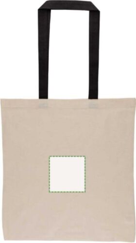 Shopping bag in cotone 140 g/m², color naturale con manici colorati, dimensioni 38 × 42 cm, manici lunghi 70 cm e larghi 2,5 cm. Questo prodotto è certificato OEKO-TEX® STANDARD 100.