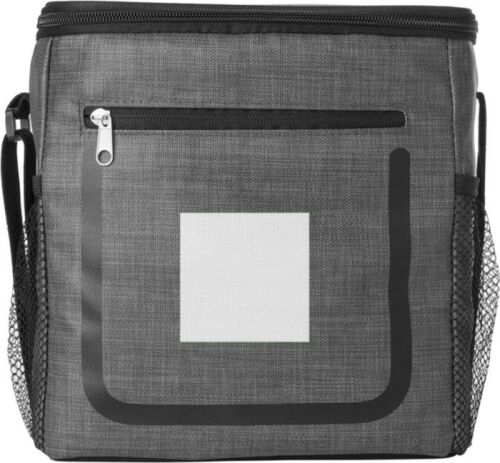 Borsa termica, con tasca anteriore con zip e scomparti retati sull'altro lato, interno rivestito con una pellicola refrigerante, tracolla regolabile, in PU