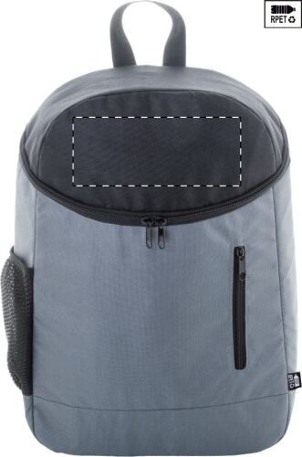 Zaino termico in poliestere 600D RPET, con imbottitura in alluminio, tasca laterale in rete, scomparto principale con cerniera, tasca frontale ed etichetta RPET.