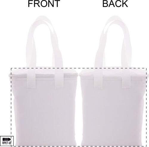 Borsa frigo in poliestere 600D RPET personalizzabile con grafica stampata in sublimazione su tutta la superficie; contiene sino a 6 lattine in alluminio da 0,33 litri, con cerniera, imbottitura ed etichetta RPET. MOQ: 25 pezzi.