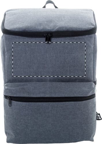 Zaino termico in poliestere 600D RPET, con imbottitura in PEVA, tasca principale con cerniera, tasca frontale, tasca laterale a rete ed etichetta RPET.