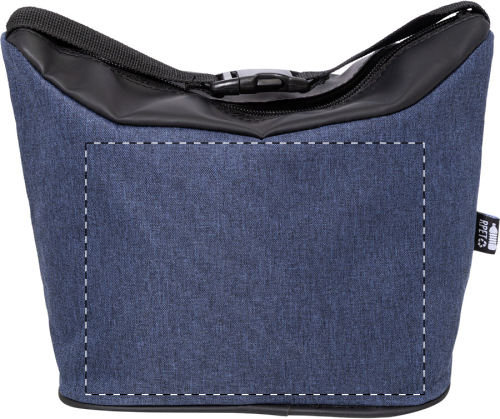 Borsa termica in poliestere 600D RPET con cerniera, dettagli in morbida pelle PU riciclata, imbottitura in alluminio, tracolla con fibbia ed etichetta RPET.