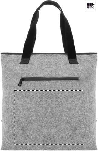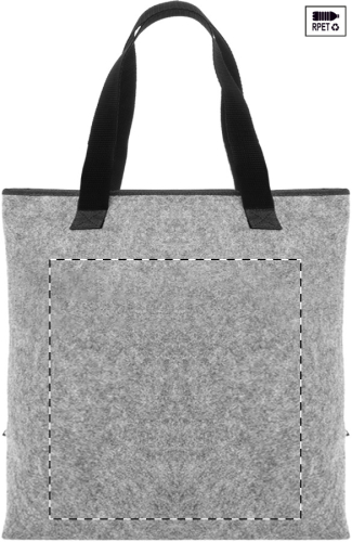 Borsa termica in feltro RPET con imbottitura in alluminio, chiusura a velcro, tasca frontale con cerniera, manici lunghi ed etichetta RPET.