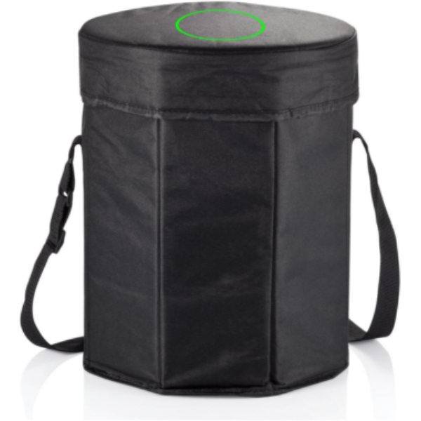 In poliestere 600D, colore nero con rivestimento in PE. Misura: 30 cm di diametro x 30 cm di altezza, è pieghevole. Può essere usato sia come frigo che come seduta.