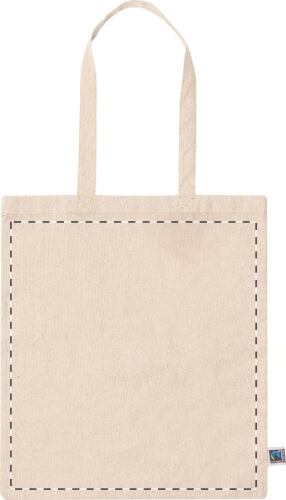 Borsa per la spesa in cotone riciclato equosolidale con manici lunghi. 100% cotone Fairtrade, 120 g/m². ed etichetta Fairtrade.