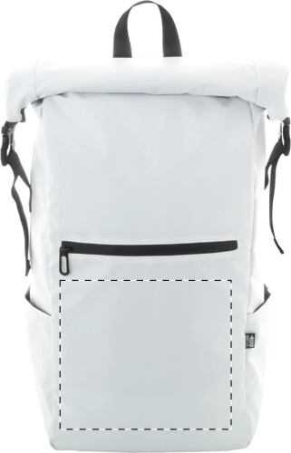 Zaino impermeabile in poliestere 600D RPET spalmato in PU, con chiusura avvolgibile completa di fibbia e velcro, scomparto imbottito per laptop (16") e tablet (10"), tasca frontale con cerniera, tasche laterali, schienale e spallacci imbottiti ed etichetta RPET.