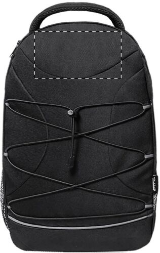 Zaino in poliestere 600D RPET con scomparti e zip, tasche laterali in rete, cordini elastici sul davanti, scomparto imbottito per laptop (15") e tablet (12"), schienale e spallacci imbottiti. Con etichetta RPET.