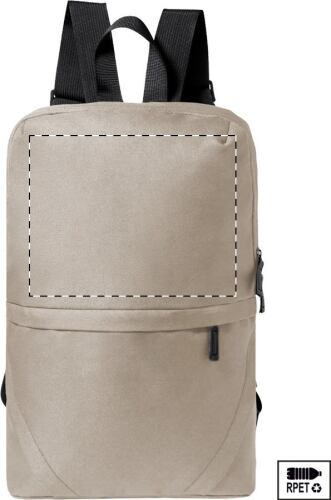 Zaino in poliestere 600D RPET con scomparti chiusi da cerniera, schienale imbottito, spallacci regolabili ed etichetta RPET.