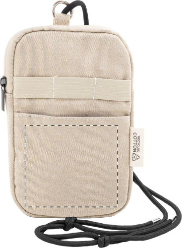 Borsa portacellulare in tela composta da 70% cotone riciclato e 30% poliestere RPET, con scomparto principale chiuso da cerniera, tasca anteriore, cordino regolabile in poliestere RPET ed etichetta cotone riciclato.