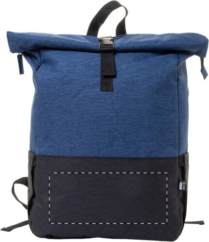 Zaino rolltop bicolore in RPET con fibbia di chiusura, scomparto principale con zip, scomparto imbottito per laptop (15") e tablet (10"), tasche laterali, schienale e spallacci imbottiti. Poliestere RPET 300D ed etichetta RPET.