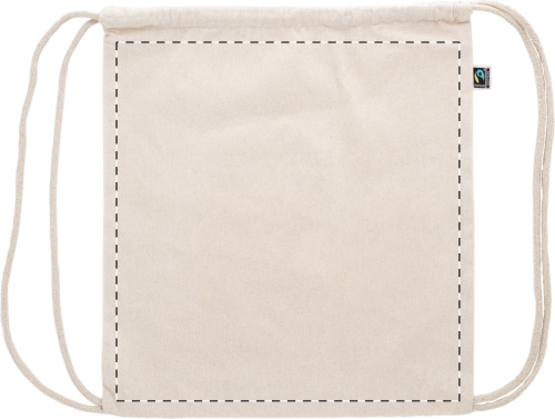 Sacca in 100% cotone equosolidale da 180 g/m² con chiusura a coulisse ed etichetta Fairtrade.