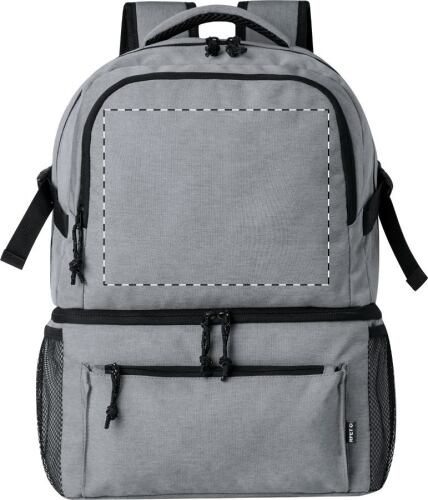 Zaino in poliestere 600D RPET con scomparto termico imbottito in PEVA, schienale e spallacci imbottiti, tasche con cerniera, laterali in rete ed etichetta RPET.
