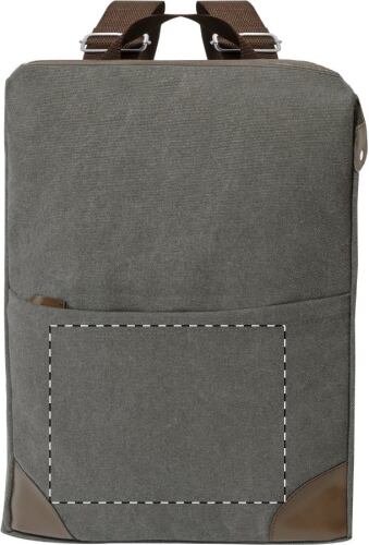 Zaino in canvas con scomparto principale chiuso da cerniera e tasca frontale. Scomparto imbottito per laptop (15") e tablet (10"), schienale imbottito e dettagli in pelle PU.