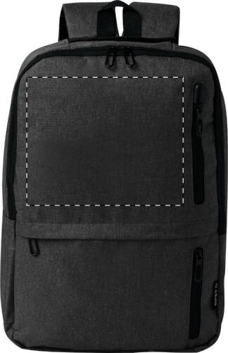 Zaino in poliestere 600D RPET con tasche chiuse da cerniera, scomparto imbottito per laptop (15") e tablet (10"), schienale e spallacci imbottiti ed etichetta RPET.