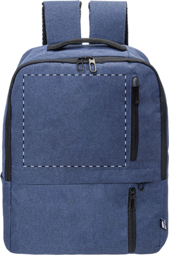 Zaino in poliestere 600D RPET con scomparto principale e 3 tasche anteriori tutte chiuse da cerniera Offre anche scomparti imbottiti per tablet (10“) e laptop (15”), schienale e spallacci imbottiti ed etichetta RPET.