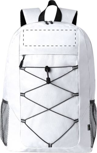 Zaino in poliestere 600D RPET con scomparto chiuso da cerniera, tasca frontale, tasche laterali in rete, schienale e spallacci imbottiti ed etichetta RPET.