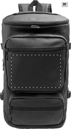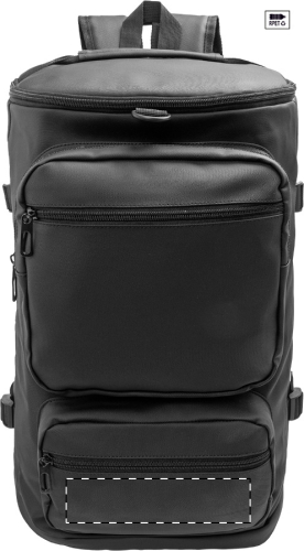 Zaino impermeabile in 600D RPET rivestito in PU, con scomparto principale e 2 tasche anteriori chiuse da cerniera, tasche laterali, scomparto per scarpe con cerniera, scomparto imbottito per laptop (15"), schienale, spallacci imbottiti ed etichetta RPET. Con cinghie laterali per regolarne la taglia.