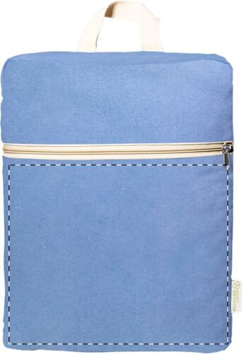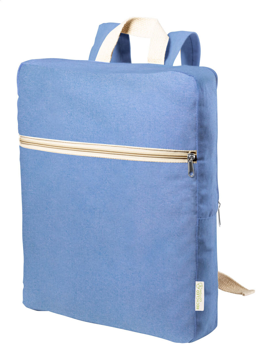 Zaino in 100% cotone riciclato da 275g/m², scomparto con chiusura a zip, tasca frontale ed etichetta cotone riciclato.
