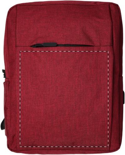 Zaino multi tasche con cerniera, scomparto imbottito per computer portatile, schienale e spallacci imbottiti. Con cinghia aggancio trolley e connettore USB per power bank integrato. Materiale: poliestere 600D.