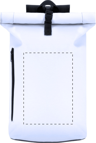 Zaino rolltop in morbida pelle PU con chiusura a fibbia, tasca frontale chiusa da cerniera, scomparto imbottito per laptop (15"), schienale e spallacci imbottiti.