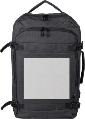 Zaino in poliestere rPET 300 D con fodera interna 210 D, adatto per computer portatile da 17 pollici, a prova di cabina, passante per il trasporto sulla parte superiore e sui lati, scomparto per laptop con velcro, tasca antifurto, due grandi scomparti con chiusura lampo, schienale imbottito ventilato, passante per trolley, fibbie di chiusura, porta USB-A sul lato, fibbie laterali per tenere compatto il bagaglio, peso massimo trasportabile circa 12 kg, include etichetta rPET