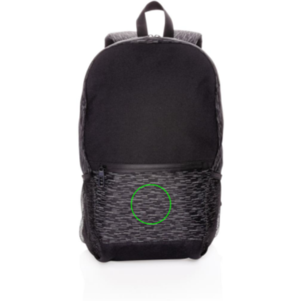 Visibilità e stile per questo zaino realizzato con materiale riciclato al 100% e tracer AWARE™. Con AWARE ™, l'uso di materiali in puro tessuto riciclato e le dichiarazioni sull'impatto sulla riduzione dell'acqua sono garantiti, grazie all'eccezionale tracer AWARE e la tecnologia blockchain. Risparmia acqua e utilizza tessuti riciclati genuini. Lo zaino presenta una moderna stampa riflettente su tutta la superficie, uno scomparto principale per un computer da 15,6 pollici, una tasca frontale con cerniera e 2 tasche in rete. Spallacci regolabili. Privo di PVC. Con questa borsa si sono risparmiati 8 litri di acqua e sono state utilizzate 16 bottiglie di plastica.