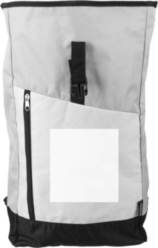Zaino rolltop in rPET 600 D, ampio scomparto sul lato superiore ed ampio vano sul davanti, entrambi con chiusura lampo, spallacci regolabili, chiusura con fibbia in plastica per il roll-top