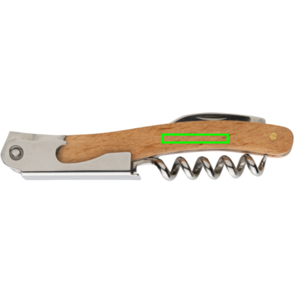 Cavatappi professionale realizzato con legno di faggio FSC 100% e acciaio inox (420) ad alta durezza e resistente alla corrosione. Durezza Rockwell 45-55. L'articolo è dotato di 3 funzioni: apribottiglie, cavatappi, tagliacapsule. Imballato in scatola FSC mix.