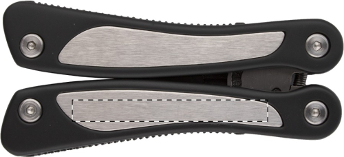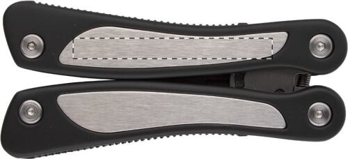 Pinza multiuso in acciaio 9 funzioni: pinze, lima per unghie, 3 cacciaviti, 2 coltelli, apriscatole con custodia in poliestere.
