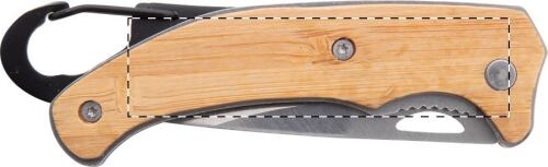 Coltello tascabile in acciaio inossidabile con chiusura di sicurezza, manico in bambù e moschettone.