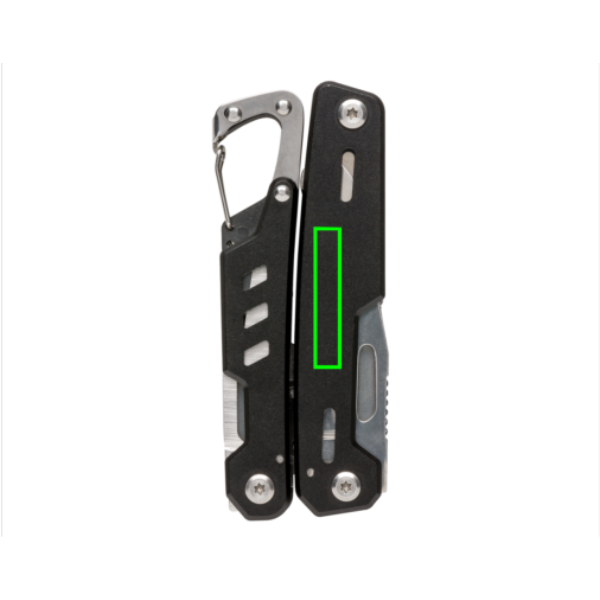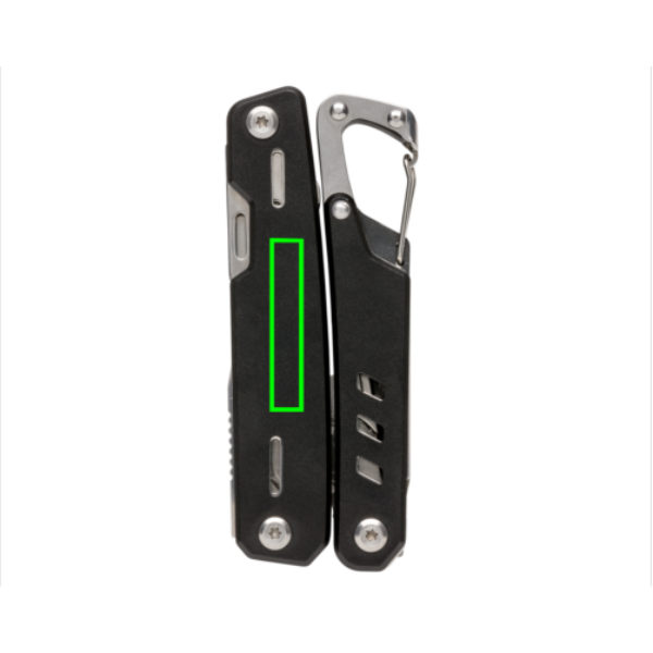Multiattrezzo con 11 funzioni robusto e resistente. Struttura in alluminio e attrezzi in acciaio inossidabile. Elenco degli attrezzi: pinze a becchi lunghi, pinza, tronchesina, coltello, cacciavite a stella, cacciavite a taglio, sega, apriscatole, cavatappi, spela fili e moschettone. In confezione regalo