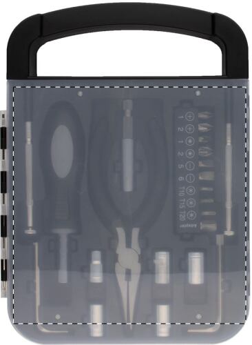 Set 22 pz attrezzi in metallo e valigetta in plastica con: 2 cacciavite, 1 pinza, 1 manico, 2 dadi esagonali, 5 chiavi a bussola, 10 punte.